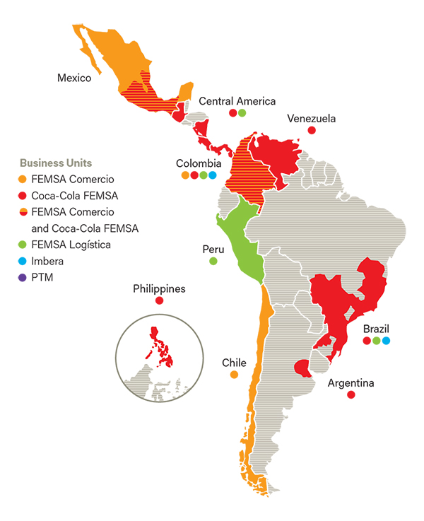 In Mexico, it has a presence in 14 states: Mexico City, Mexico City, Puebla, Morelos, Tlaxcala, Querétaro Guanajuato, Michoacán, Veracruz, Guerrero, Tampico, Oaxaca, Chiapas and Tabasco. It has 24 production plants, 145 distribution centers, more than 850 thousand points of sale, serves 71.1 million consumers and offers employment to more than 43 thousand employees, being the largest bottler in the country.